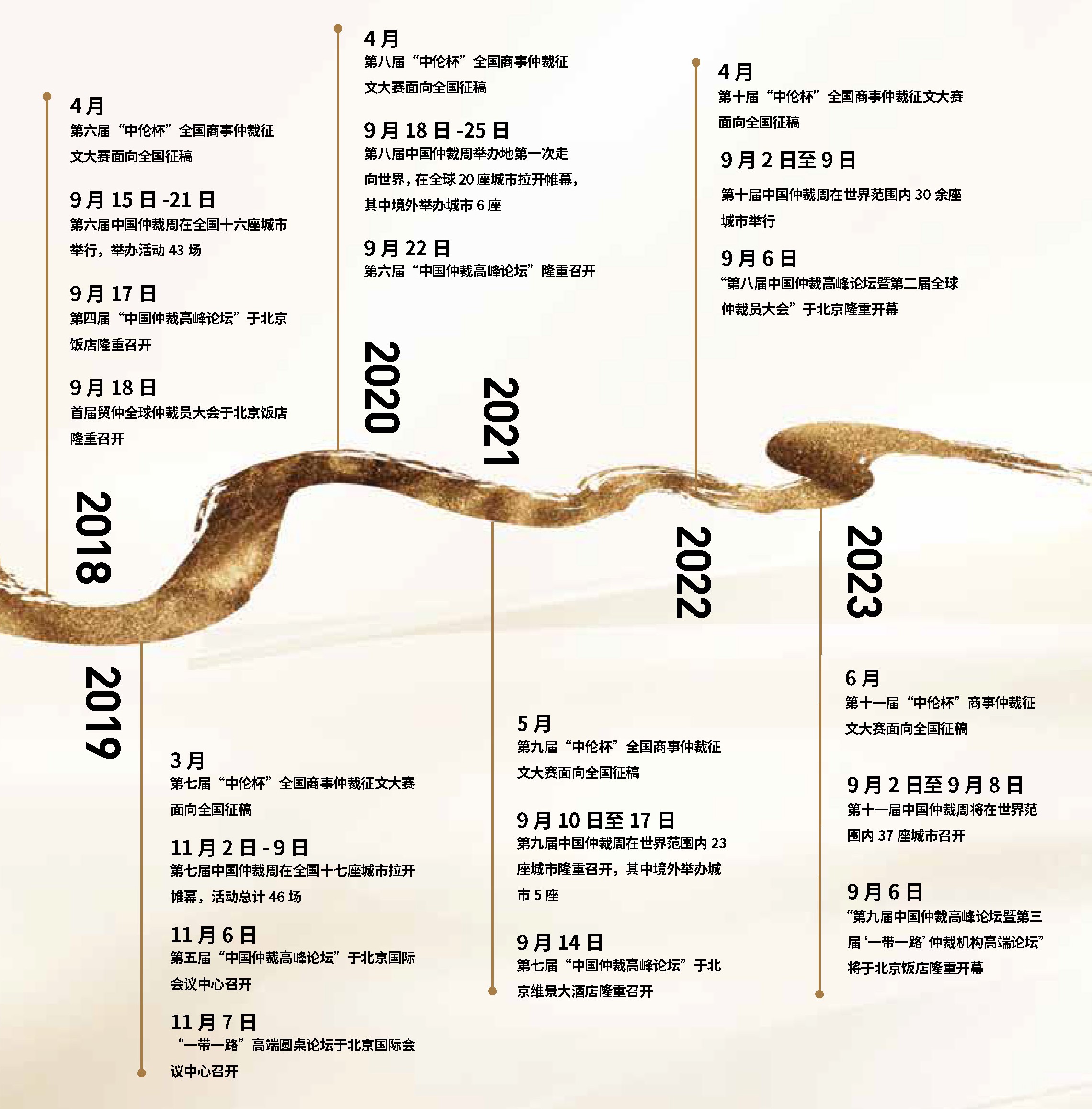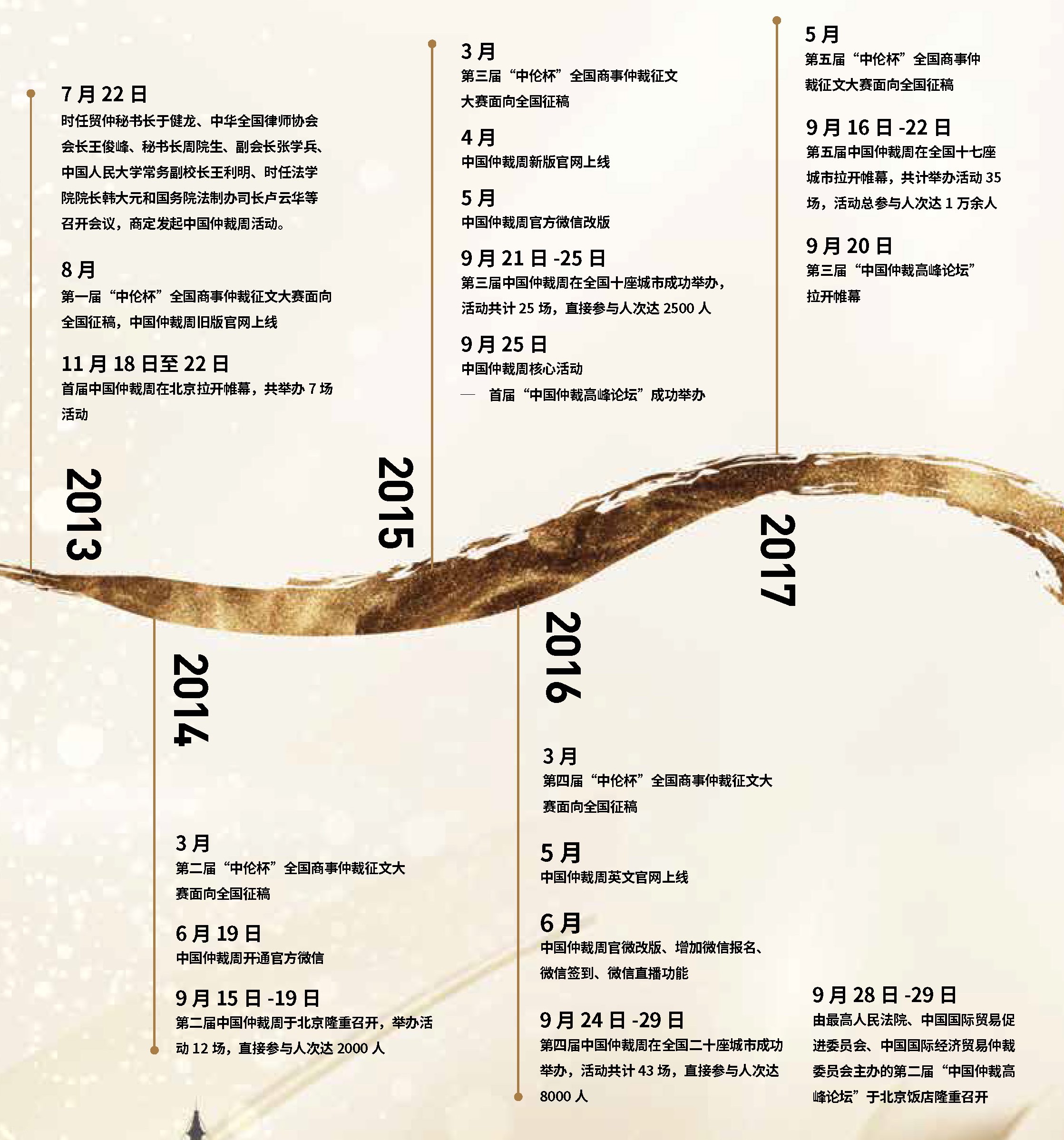 中國仲裁周是中國國際經(jīng)濟貿(mào)易仲裁委員會聯(lián)合中國人民大學、中華全國律師協(xié)會、北京市律師協(xié)會于2013年共同發(fā)起成立的以仲裁和爭議解決為主題的活動平臺。中國仲裁周系列活動每年在國內(nèi)外數(shù)十座城市同時舉辦,得到社會各界的廣泛認可和積極參與。十年來,中國仲裁周系列活動漸已成為國際上深具影響力的仲裁法律界活動之一。