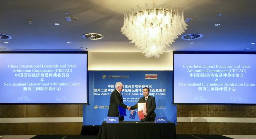 貿(mào)仲代表團(tuán)出席了由中國貿(mào)促會和新西蘭中國貿(mào)易協(xié)會共同主辦的中國-新西蘭商務(wù)理事會會議暨第二屆中國國際供應(yīng)鏈促進(jìn)博覽會新西蘭路演。任鴻斌會長出席活動并致辭,新西蘭-中國貿(mào)易協(xié)會主席約翰·考克倫(John Cochrane)、新西蘭貿(mào)發(fā)局大中華區(qū)主任白安祖(Andrew White)、中國駐新西蘭大使王小龍、駐奧克蘭總領(lǐng)事陳世杰等出席活動,中新兩國工商界代表200余與會。會上,貿(mào)仲副主任兼秘書長王承杰與新西蘭國際仲裁中心主任約翰·格林(John Green)代表雙方簽訂了合作協(xié)議。該合作協(xié)議搭建了中新兩國仲裁機(jī)構(gòu)的交流平臺,有利于通過共同努力增進(jìn)中方和新方企業(yè)在仲裁、爭議風(fēng)險(xiǎn)防范等方面的認(rèn)識與理解。