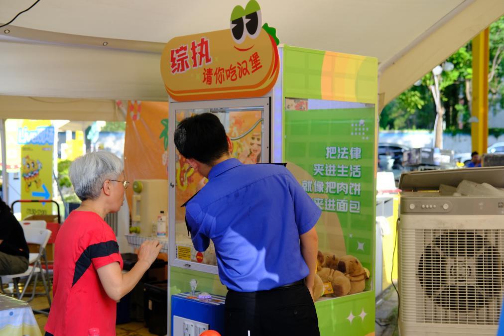 作為城市潮流地標,集盒廣場在青年群體中樹立了獨特的“潮工作、玩生活”品牌形象。因此,屬地東勝中隊在開展普法宣傳過程中,兼顧街區(qū)運營主體與商戶核心訴求、青年群眾體驗需求與價值認同,積極借助集盒廣場舉辦寧波咖啡生活周、漢堡節(jié)、暑期夜市等大規(guī)模集市期間的青年群體集聚效應(yīng),深挖街區(qū)文化地標與潮流IP潛力,在果殼箱、綠化帶、共享單車停放點等顯著位置上設(shè)置綜合執(zhí)法Q版形象普法牌,以“一句話”形式生動傳遞法律知識、引導(dǎo)文明行為。同時,創(chuàng)新推出“綜執(zhí)請你吃漢堡”等主題攤位,精心設(shè)計“知識問答+潮玩互動+獎品兌換”的普法鏈條,參與者通過挑戰(zhàn)法律知識問答,贏取娃娃機游戲幣來抓取捆綁著漢堡兌換券的幸運玩偶,再在漢堡節(jié)上進行任意兌換。這種將嚴肅法律條文轉(zhuǎn)化為趣味挑戰(zhàn)的“游戲化”普法模式,顛覆了傳統(tǒng)的單向宣傳方式,通過互動性與獲得感的雙重驅(qū)動,讓法律知識在歡聲笑語中沁入人心。