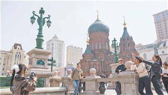 黑龍江省哈爾濱市,游客在索菲亞教堂附近游玩。哈爾濱市有“萬國建筑博物館”的美譽(yù),當(dāng)?shù)赝诰驓v史底蘊(yùn),塑造城市發(fā)展新高度。新華社記者 謝劍飛攝