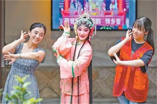 福建省福州市鼓樓區(qū)安泰街道綜合文化站,閩劇演員(中)教授表演技藝。當(dāng)?shù)赝苿印肮咆?非遺+展演”等多元化發(fā)展,有效傳播閩都“?!蔽幕?,構(gòu)建“15分鐘幸福生活圈”,讓市民和游客感受非遺之美。謝貴明攝(人民視覺)