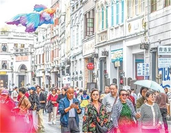 海南省??谑写蛟焯厣幕放?,騎樓老街經(jīng)過改造升級,成為休閑娛樂好去處。圖為游客在騎樓老街游玩??档橇軘z(人民視覺)