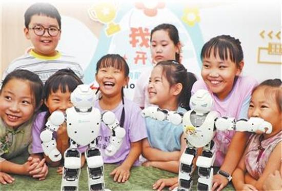 山東省東營市東營區(qū)辛店街道明珠社區(qū),小朋友學(xué)習(xí)機(jī)器人操作方法??破战逃M(jìn)社區(qū),進(jìn)一步提升居民科學(xué)素養(yǎng)。劉智峰攝(影像中國)