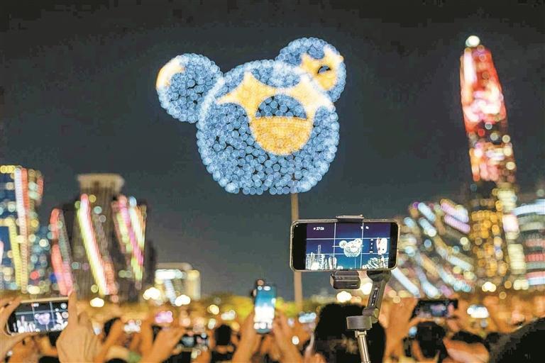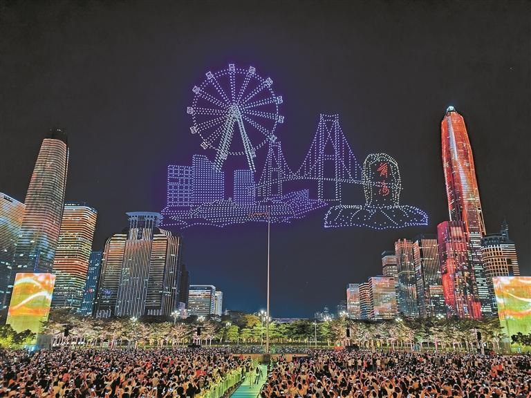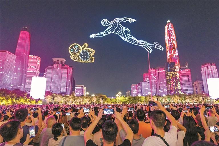 當無人機陣列掠過夜空,地面建筑群也將隨之脈動。流光從云端灑向樓宇,色彩如呼吸般明滅變幻,天地連成一體。霓虹勾勒出特區(qū)發(fā)展長卷,光影流轉中浮現(xiàn)特區(qū)精神的時代符號——這是一座城市向自己的生日深情致敬。