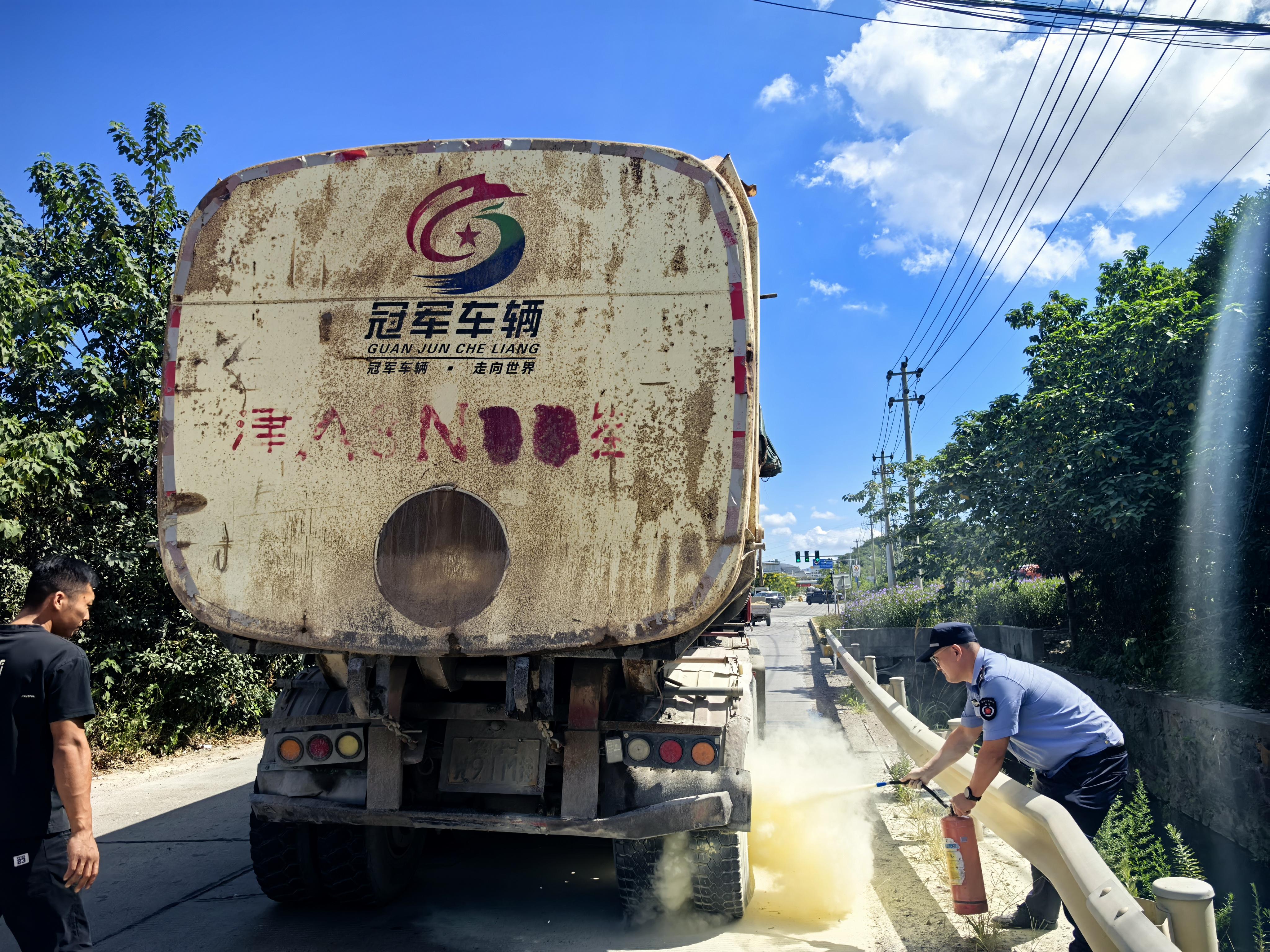 “快看,那車好像著火了!”8月27日9時(shí)30分許,戚家山綜合行政執(zhí)法中隊(duì)執(zhí)法人員張順東正帶隊(duì)對一過路渣土車開展例行檢查,渣土車司機(jī)王先生在等待檢查期間發(fā)現(xiàn)路邊一輛罐車車輪冒出濃煙,執(zhí)法人員聽聞后立即上前查看。此時(shí),罐車的后輪軸承處已經(jīng)起火。而罐車司機(jī)在隊(duì)員們提醒下才發(fā)現(xiàn)起火。