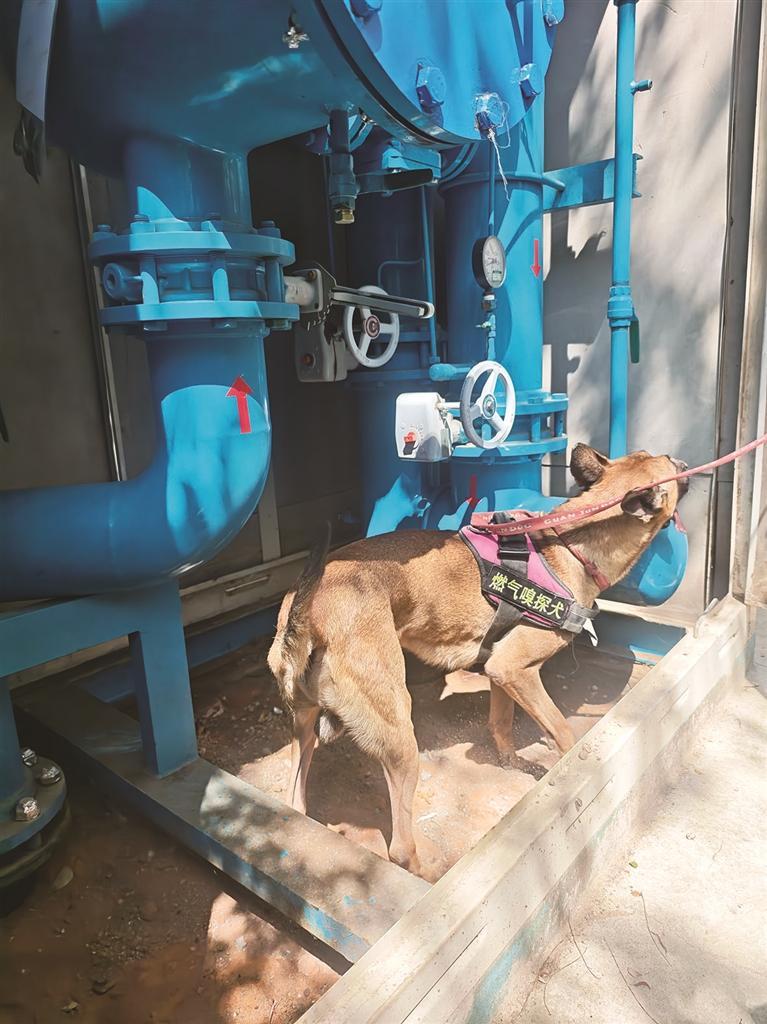 在實(shí)際工作中,嗅探犬沿燃?xì)夤芫€、閥門井、調(diào)壓箱柜等關(guān)鍵部位進(jìn)行巡檢。一旦發(fā)現(xiàn)異常,它們會以臥倒、靜立、用前爪刨地等特定動作示警。工作人員隨即使用檢測儀器進(jìn)行復(fù)核,精準(zhǔn)定位泄漏點(diǎn)并及時處置,有效彌補(bǔ)了人工巡檢在主觀判斷點(diǎn)位測量方面的局限性。