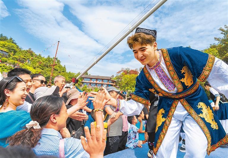 10月3日,湖南省吉首市矮寨大橋景區(qū)上演“56個(gè)民族風(fēng)情盛會(huì)”,演員與游客互動(dòng),現(xiàn)場(chǎng)十分熱鬧。梁永鴻攝(中經(jīng)視覺(jué))