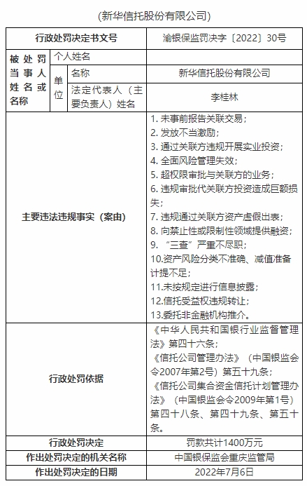 銀保監(jiān)會網(wǎng)站今日公布了重慶銀保監(jiān)局行政處罰信息公開表(渝銀保監(jiān)罰決字〔2022〕30號、16號、18號、19號、20號、21號、22號、23號、24號、25號、26號、27號、28號、29號、31號、32號)顯示,新華信托股份有限公司存在13宗主要違法違規(guī)事實(shí):未事前報(bào)告關(guān)聯(lián)交易;發(fā)放不當(dāng)激勵(lì);通過關(guān)聯(lián)方違規(guī)開展實(shí)業(yè)投資;全面風(fēng)險(xiǎn)管理失效;超權(quán)限審批與關(guān)聯(lián)方的業(yè)務(wù);違規(guī)審批代關(guān)聯(lián)方投資造成巨額損失;違規(guī)通過關(guān)聯(lián)方資產(chǎn)虛假出表;向禁止性或限制性領(lǐng)域提供融資;“三查”嚴(yán)重不盡職;資產(chǎn)風(fēng)險(xiǎn)分類不準(zhǔn)確、減值準(zhǔn)備計(jì)提不足;未按規(guī)定進(jìn)行信息披露;信托受益權(quán)違規(guī)轉(zhuǎn)讓;委托非金融機(jī)構(gòu)推介。