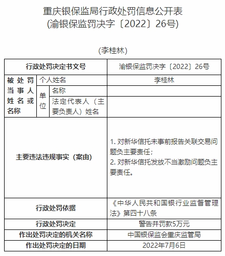 李桂林對新華信托未事前報(bào)告關(guān)聯(lián)交易問題負(fù)主要責(zé)任、對新華信托發(fā)放不當(dāng)激勵(lì)問題負(fù)主要責(zé)任。依據(jù)《中華人民共和國銀行業(yè)監(jiān)督管理法》第四十八條,中國銀保監(jiān)會重慶監(jiān)管局對其警告并罰款5萬元。