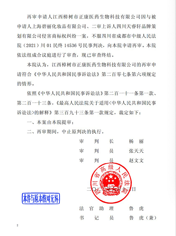 6月13日,四川高院決定對(duì)江西樟樹市正康醫(yī)藥生物科技有限公司與被申請(qǐng)人上海碧麗化妝品有限公司案申請(qǐng)?jiān)賹彴高M(jìn)行提審,并裁定,再審期間中止原判決的執(zhí)行。