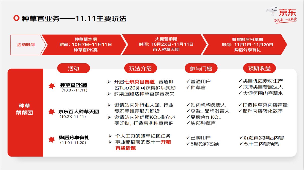 京東11.11期間,“種草官業(yè)務(wù)”將推出“種草PK賽”、“京東百人種草天團(tuán)”、“購后分享有禮”三大玩法,開啟七條類目賽道,邀請站內(nèi)外行業(yè)大咖、優(yōu)質(zhì)KOL推薦好貨,并通過曬單紅包任務(wù)和參與“11.11開箱有獎(jiǎng)話題”激勵(lì)種草官進(jìn)行分享。