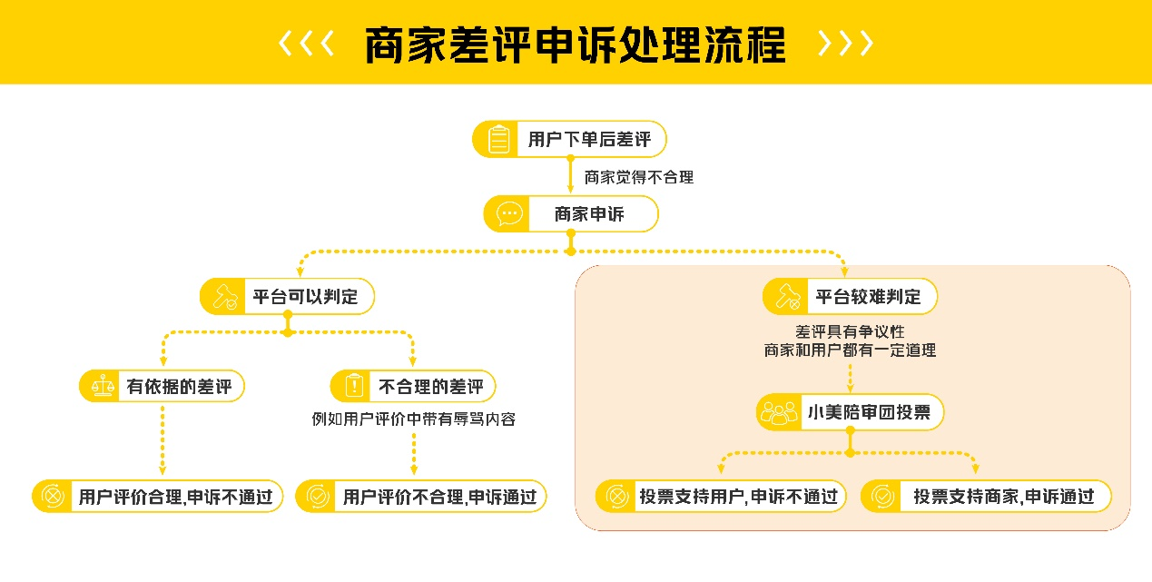 為了保障用戶合理評價權(quán)益、避免商家遭受不合理差評的影響,美團外賣升級迭代產(chǎn)品功能,引入公眾評審機制——小美陪審團。用戶和商家之間如果出現(xiàn)爭議差評,且雙方難以主動達成和解時,熱心的社會公眾、用戶和商家都可以報名作為評審員,根據(jù)用戶和商家雙方提供的材料判斷,并對爭議差評進行投票判定。