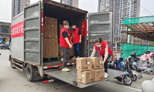 在蘇果月苑社區(qū)店門口,員工們正在緊張的往貨車上裝箱?!斑@批物資是給一個封控單位送的,主要是牙刷、牙膏、毛巾,襪子等生活用品?!遍T店負責人崔云正在統(tǒng)籌指揮門店員工有序工作,“門店也有一半員工被封控在家,雖然人手短缺,但大家工作積極性很高,這兩天都是全天在線?!?/p>