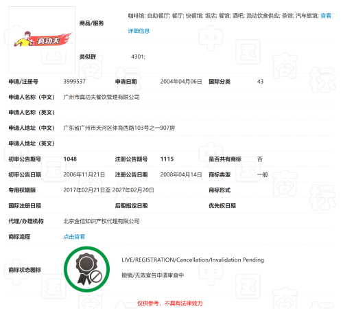 以“真功夫及圖”(注冊號:3999537)為例,中國商標(biāo)網(wǎng)顯示,該商標(biāo)為真功夫于2004年申請注冊的第43類“餐廳”等服務(wù)商標(biāo),專用權(quán)期限原為2017年2月21日至2027年2月20日。