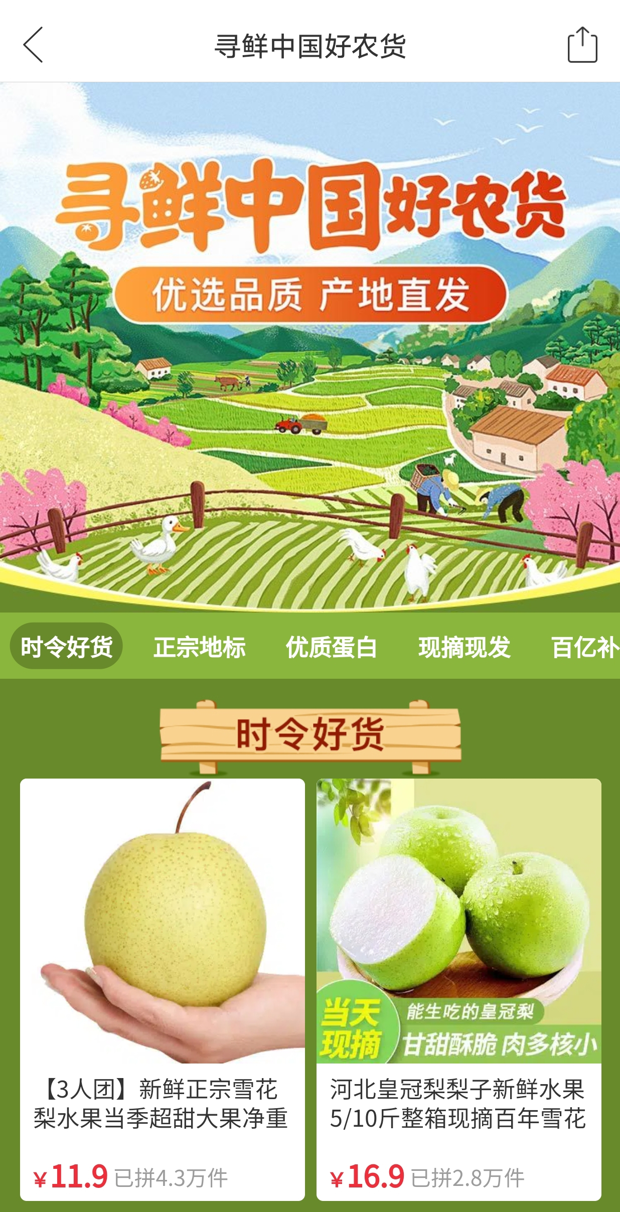 活動期間,消費者打開拼多多app,搜索“尋鮮中國”“多多好農(nóng)貨”“好農(nóng)貨”等關(guān)鍵詞,即可直達專區(qū),選購時令地標農(nóng)貨。