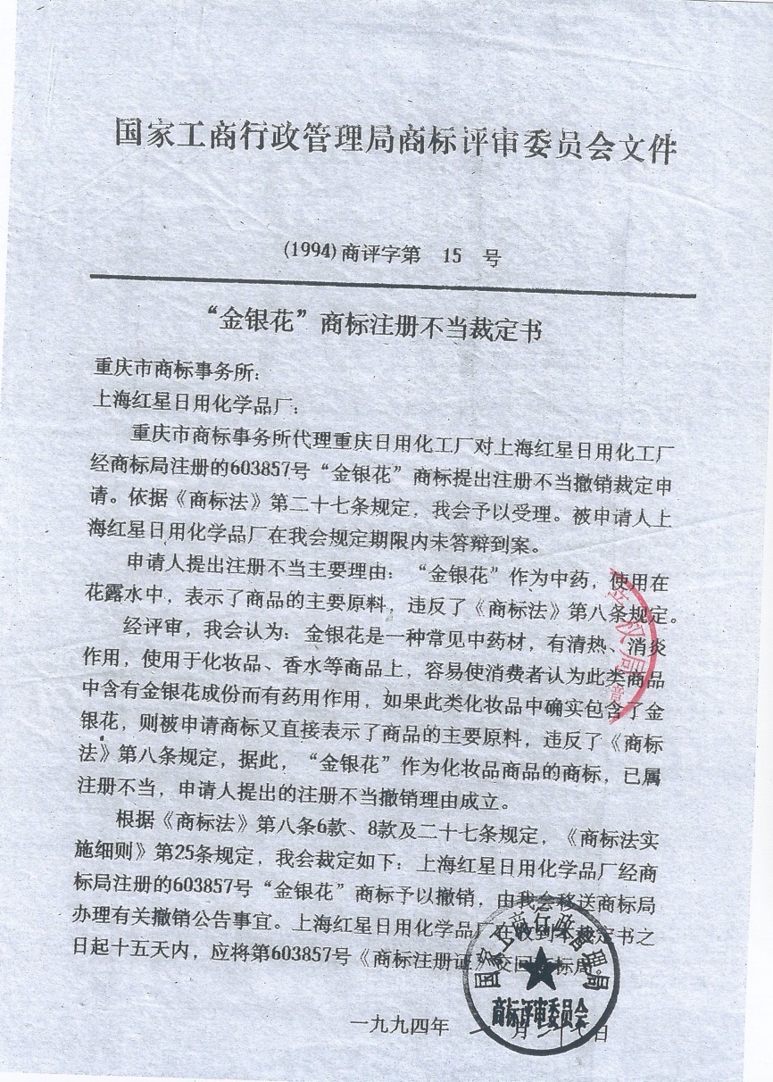 申請人詩妍公司向法庭展示了(1994)商評字第15號“金銀花”商標注冊不當裁定書。這份裁定書載明,重慶日用化工廠對上海紅星日用化工廠(金銀花商標的注冊人)提出了商標注冊不當撤銷申請,當時的國家工商行政管理局商標評審委員會作出裁定:對該商標予以撤銷。