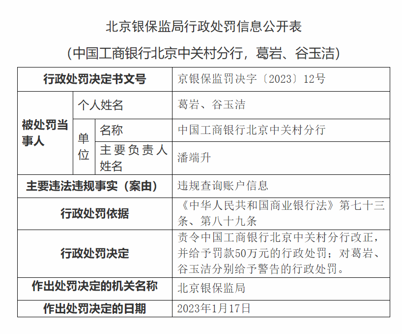 1月28日,北京銀保監(jiān)局行政處罰信息公開(kāi)表顯示,中國(guó)工商銀行北京中關(guān)村分行主要違法違規(guī)事實(shí)為,違規(guī)查詢賬戶信息。2023年1月17日,北京銀保監(jiān)局責(zé)令中國(guó)工商銀行北京中關(guān)村分行改正,并給予罰款50萬(wàn)元的行政處罰;對(duì)葛巖、谷玉潔分別給予警告的行政處罰。