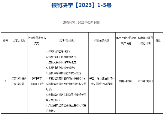 針對上述違法行為,中國人民銀行對江蘇銀行處以警告,沒收違法所得42元,并罰款773.6萬元。行政處罰決定日期為2023年2月6日。