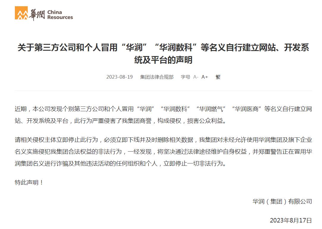 華潤(rùn)(集團(tuán))有限公司(以下簡(jiǎn)稱“華潤(rùn)集團(tuán)”)的聲明稱,近期,公司發(fā)現(xiàn)個(gè)別第三方公司和個(gè)人冒用“華潤(rùn)”“華潤(rùn)數(shù)科”“華潤(rùn)燃?xì)狻薄叭A潤(rùn)醫(yī)商”等名義自行建立網(wǎng)站、開發(fā)系統(tǒng)及平臺(tái),此行為嚴(yán)重侵害了華潤(rùn)集團(tuán)商譽(yù),構(gòu)成侵權(quán),損害公眾利益。