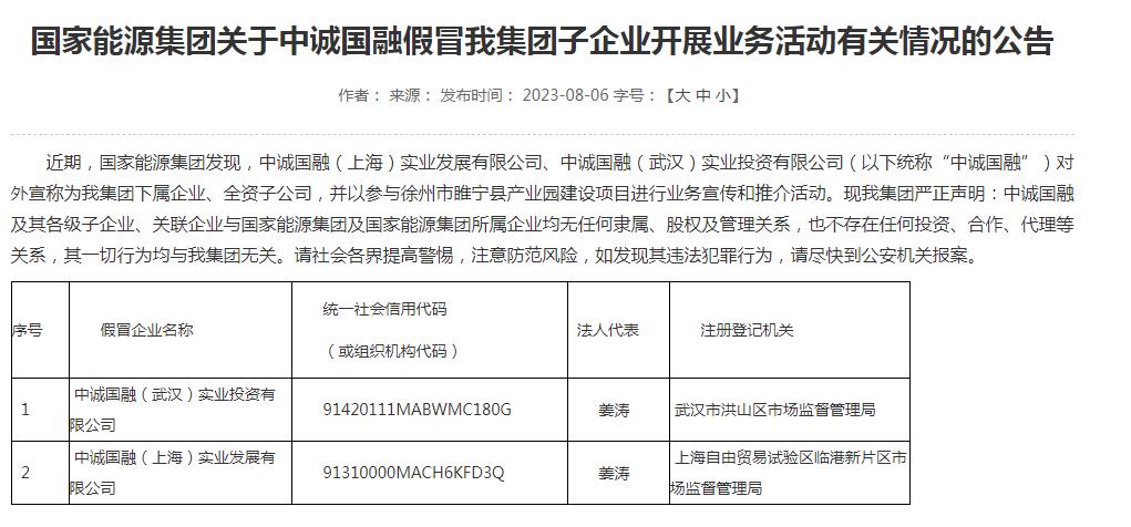 8月6日,國(guó)家能源集團(tuán)發(fā)布了關(guān)于中誠(chéng)國(guó)融假冒集團(tuán)子企業(yè)開展業(yè)務(wù)活動(dòng)有關(guān)情況的公告。