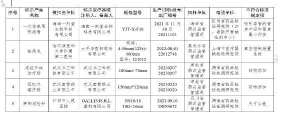被抽檢項目不符合標(biāo)準(zhǔn)規(guī)定的產(chǎn)品包括呼吸道用吸引導(dǎo)管(吸痰管)2批次:分別為海南一劑堂生物科技有限公司、太平洋醫(yī)材股份有限公司生產(chǎn),涉及吸引導(dǎo)管的管身外徑和管身最小內(nèi)徑、真空控制裝置性能不符合標(biāo)準(zhǔn)規(guī)定。