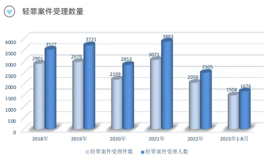 2018年1月至2023年8月,海淀區(qū)檢察院共受理審查起訴輕罪案件14713件18165人,案件數(shù)和人數(shù)分別占全院受理審查起訴案件總數(shù)的82%、77%。