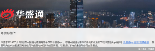 3月8日,華盛證券宣布,自當(dāng)日起在中國(guó)境內(nèi)應(yīng)用商店下架華盛通App。華盛證券表示,此次調(diào)整不影響存量境內(nèi)客戶繼續(xù)使用華盛通App。存量境內(nèi)客戶仍可通過華盛通App進(jìn)行交易,相關(guān)服務(wù)和業(yè)務(wù)均不受影響。此外,公告還指出,未來華盛證券將繼續(xù)服務(wù)好所有存量境內(nèi)客戶,為存量境內(nèi)客戶提供優(yōu)質(zhì)產(chǎn)品、服務(wù)及客戶體驗(yàn)。