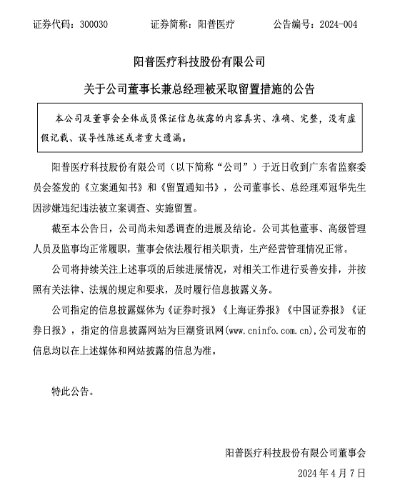 4月7日晚間,陽普醫(yī)療(300030.SZ,股價(jià)5.5元,市值17.01億元)公告,于近日收到廣東省監(jiān)察委員會(huì)簽發(fā)的《立案通知書》和《留置通知書》,公司董事長(zhǎng)、總經(jīng)理鄧冠華因涉嫌違紀(jì)違法被立案調(diào)查、實(shí)施留置。截至公告日,公司尚未知悉調(diào)查的進(jìn)展及結(jié)論。公司其他董事、高級(jí)管理人員及監(jiān)事均正常履職,董事會(huì)依法履行相關(guān)職責(zé),生產(chǎn)經(jīng)營(yíng)管理情況正常。