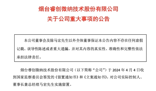 4月7日晚間,睿創(chuàng)微納(688002.SH,股價(jià)36.94元,市值165.23億元)發(fā)布公告稱,公司于4月4日收到國(guó)家監(jiān)察委員會(huì)簽發(fā)的《留置通知書》和《立案通知書》,對(duì)公司實(shí)際控制人、董事長(zhǎng)兼總經(jīng)理馬宏實(shí)施留置。