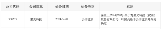 4月7日,據(jù)深交所網(wǎng)站,深交所對(duì)聚光科技(杭州)股份有限公司(聚光科技,300203.SZ)及其控股子公司時(shí)任總經(jīng)理葉國(guó)兵給予公開(kāi)譴責(zé)處分。