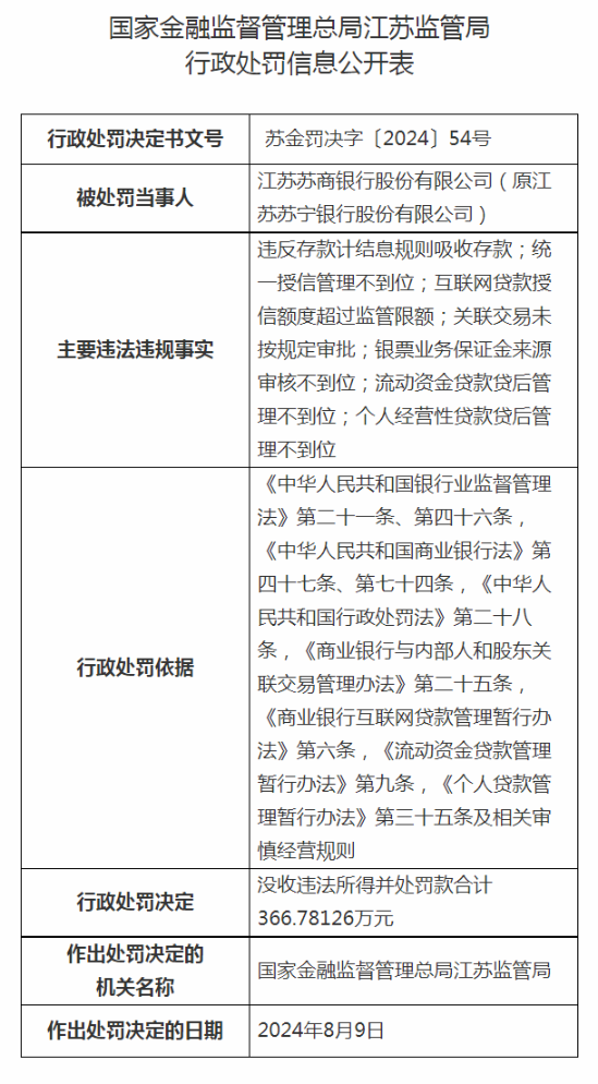 8月20日,國家金融監(jiān)督管理總局江蘇監(jiān)管局發(fā)布7個行政處罰公開表,江蘇蘇商銀行股份有限公司(原江蘇蘇寧銀行股份有限公司)因7項違法違規(guī)行為被罰沒366萬余元。同時,該行行長王景斌等6名責(zé)任人也收到了不同程度的處罰。