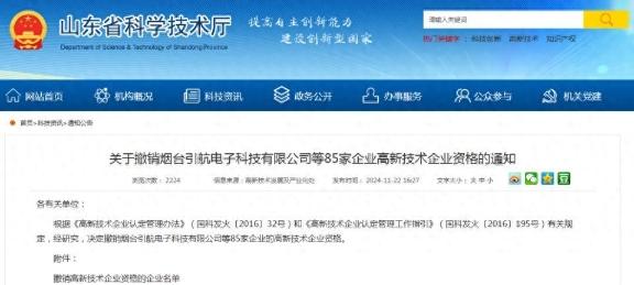 《通知》內(nèi)容顯示,根據(jù)《高新技術(shù)企業(yè)認(rèn)定管理辦法》(國(guó)科發(fā)火〔2016〕32號(hào))和《高新技術(shù)企業(yè)認(rèn)定管理工作指引》(國(guó)科發(fā)火〔2016〕195號(hào))有關(guān)規(guī)定,經(jīng)研究,決定撤銷煙臺(tái)引航電子科技有限公司等85家企業(yè)的高新技術(shù)企業(yè)資格。山東萊鋼永鋒鋼鐵有限公司則列于名單第78位,證書編號(hào)GR202237007406,撤銷起始年份為2023年。