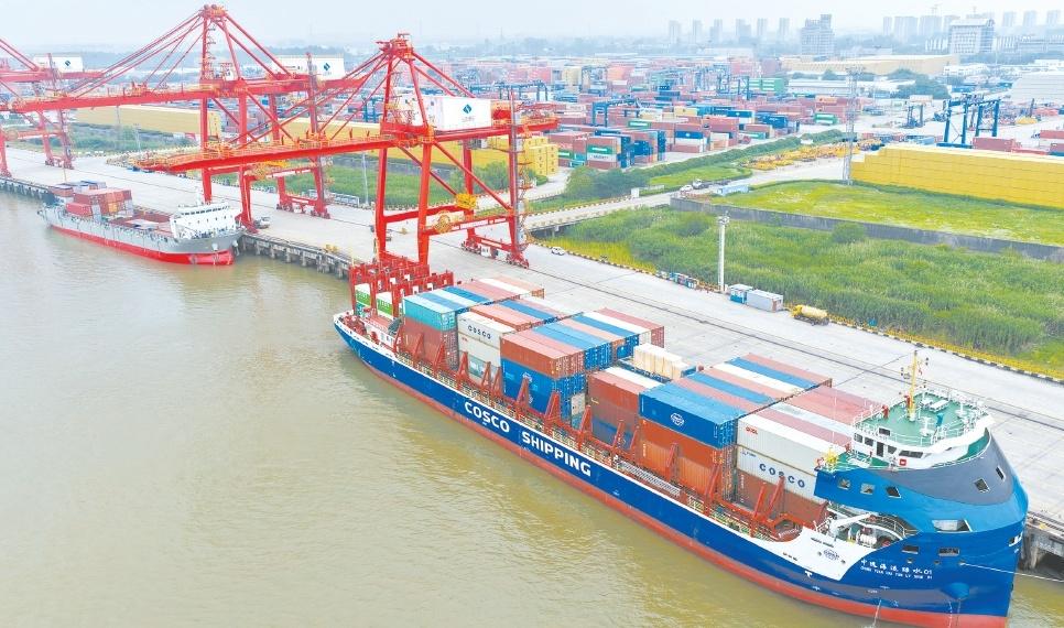 海關(guān)總署9日發(fā)布數(shù)據(jù)顯示,今年前5個月我國貨物貿(mào)易進出口同比增長2.5%。圖為9日當(dāng)天的南京港龍?zhí)陡蹍^(qū)。(視覺中國)