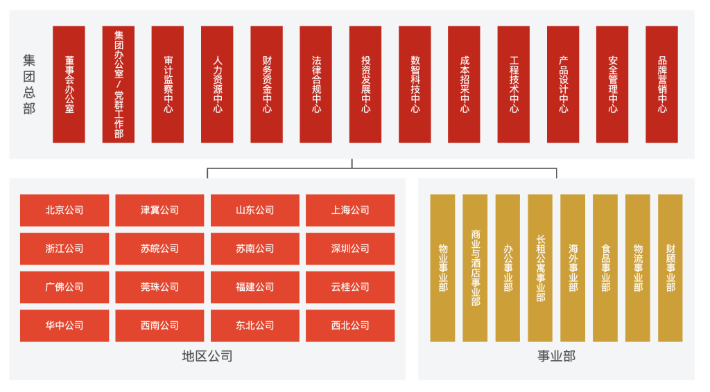 根據(jù)最新的組織架構(gòu),萬科集團(tuán)總部除了董事會辦公室、集團(tuán)辦公室/黨群工作部外,還設(shè)有投資發(fā)展中心、成本招采中心、工程技術(shù)中心、產(chǎn)品設(shè)計中心等11個中心;地區(qū)公司分為北京公司、津冀公司、山東公司、上海公司等16個公司;原物業(yè)事業(yè)集團(tuán)(BG)等統(tǒng)一歸為事業(yè)部,目前包含物業(yè)、商業(yè)與酒店、辦公、長租公寓、物流等八大多元化業(yè)務(wù)。