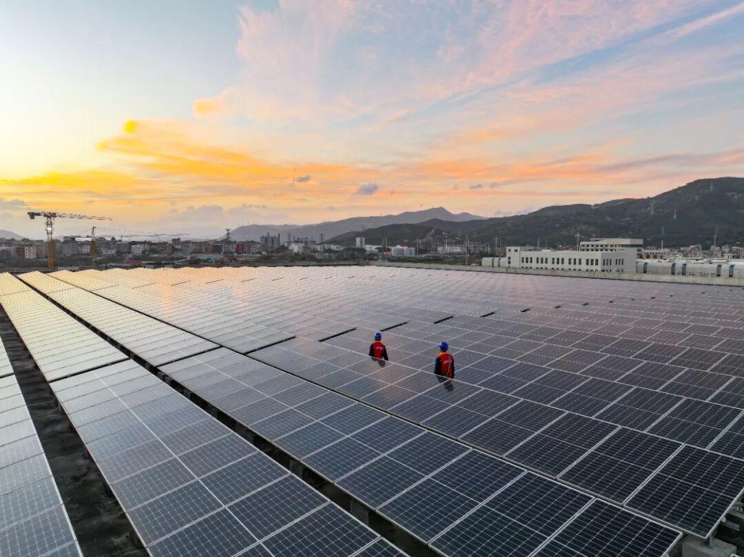 國(guó)網(wǎng)福州供電公司工作人員正在對(duì)光伏設(shè)備進(jìn)行巡檢。 CFP