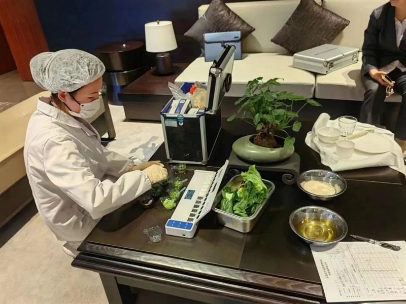 活動現(xiàn)場,云巖區(qū)市場監(jiān)督管理局快檢中心工作人員對貴州飯店貴賓樓后廚使用的食材、器具進(jìn)行了快速檢測。共抽檢16批次,其中糧油2批次、蔬菜8批次、餐具6批次,檢測項(xiàng)目為陳化糧、酸價、農(nóng)藥殘留、餐具潔凈度,未檢測出超標(biāo)項(xiàng)目。