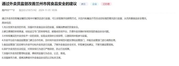 該網(wǎng)友建議建立便捷的舉報渠道,如設(shè)立專門的舉報電話、郵箱或在線平臺,方便外賣員隨時舉報發(fā)現(xiàn)的食品安全問題;對舉報屬實的外賣員給予一定的獎勵,如現(xiàn)金獎勵、積分獎勵等,以激勵其積極參與監(jiān)督;食品監(jiān)管部門應(yīng)定期與外賣平臺和外賣員進行溝通,了解外賣食品安全狀況,聽取意見和建議,不斷完善監(jiān)管措施;保護外賣員的合法權(quán)益,對其舉報行為進行嚴格保密,防止打擊報復(fù);加強對外賣員的管理和監(jiān)督,確保其監(jiān)督行為合法、公正、客觀;加強宣傳力度,提高消費者對外賣食品安全的認識和關(guān)注度。
