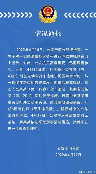 4月17日,天津市公安局寧河公安分局發(fā)布情況通報(bào)。通報(bào)中指出,4月16日,寧河公安分局接報(bào)警,一男子對(duì)一倒地受傷外賣騎手進(jìn)行辱罵的視頻在網(wǎng)上流傳。經(jīng)查,4月15日晚,外賣騎手婁某某駕駛電動(dòng)自行車途經(jīng)寧河區(qū)蘆臺(tái)街時(shí),與一輛停在路邊的吉普車發(fā)生剮蹭后駛離現(xiàn)場(chǎng),駕駛?cè)嗣茨衬绸{車追趕,其朋友劉某某同時(shí)徒步追趕,過程中劉某某用拳頭擊打外賣騎手頭部,致其倒地磕破頭皮,形成6厘米傷口(無生命危險(xiǎn)),隨后趕來的么某某對(duì)其辱罵。