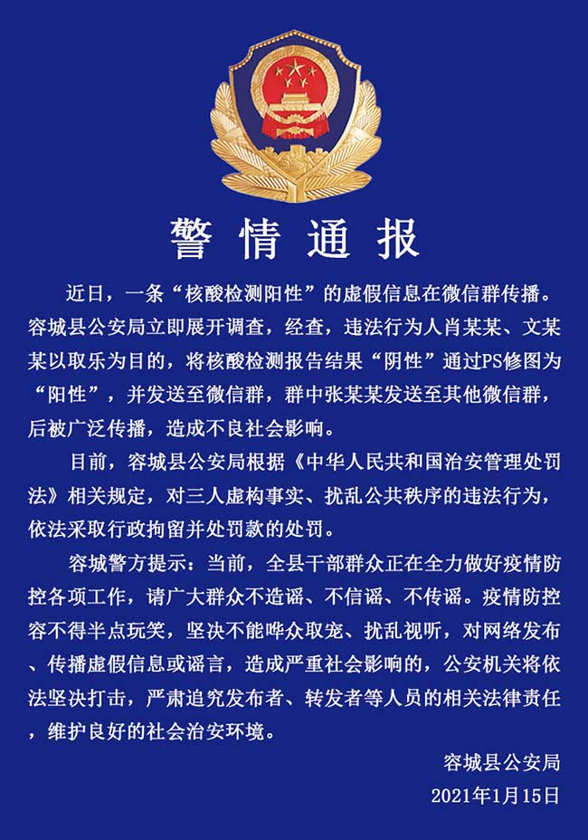 人民網(wǎng)雄安1月15日 (王紅 何美萱)據(jù)雄安新區(qū)容城縣公安局消息,容城縣3人因傳播“核酸檢測陽性”虛假信息被行政拘留并處罰款。