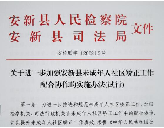 在高墻之外,未檢檢察官發(fā)現(xiàn)當(dāng)?shù)厣鐓^(qū)矯正機(jī)構(gòu)對(duì)未成年社區(qū)矯正對(duì)象未制定個(gè)性化矯正方案和針對(duì)性的矯正措施,且未按規(guī)定轉(zhuǎn)送法律文書、抄送調(diào)查評(píng)估報(bào)告和解除社區(qū)矯正證明書問題較為普遍。為此,安新縣檢察院向安新縣司法局發(fā)出檢察建議,與縣司法局專門召開進(jìn)一步規(guī)范未成年人社區(qū)矯正工作會(huì),推動(dòng)相關(guān)問題得到及時(shí)整改,并于2022年3月與縣司法局會(huì)簽了《關(guān)于進(jìn)一步加強(qiáng)安新縣未成年人社區(qū)矯正工作配合協(xié)作的實(shí)施辦法》,建立長(zhǎng)效監(jiān)督、配合與協(xié)作工作機(jī)制。