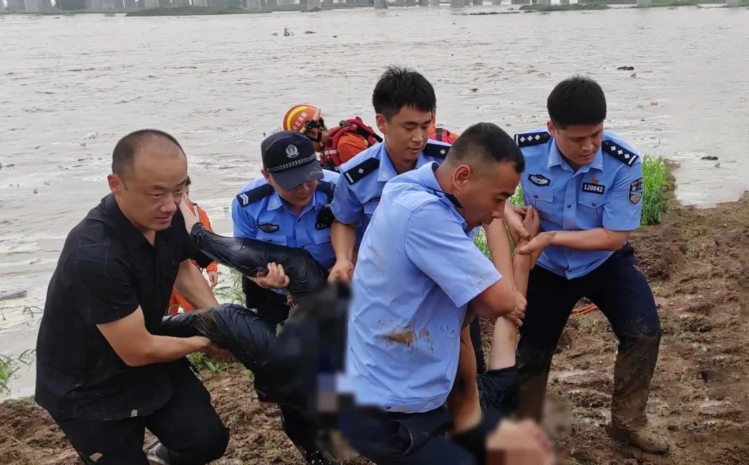 因分洪道周邊土質較軟、道路泥濘,車輛難以通行,時間就是生命,民警來不及猶豫,全部脫掉鞋子光腳踩過50公分深淤泥區(qū)翻越北大堤后到達現(xiàn)場,發(fā)現(xiàn)兩人被困于某項目部南側新蓋房分洪道內。