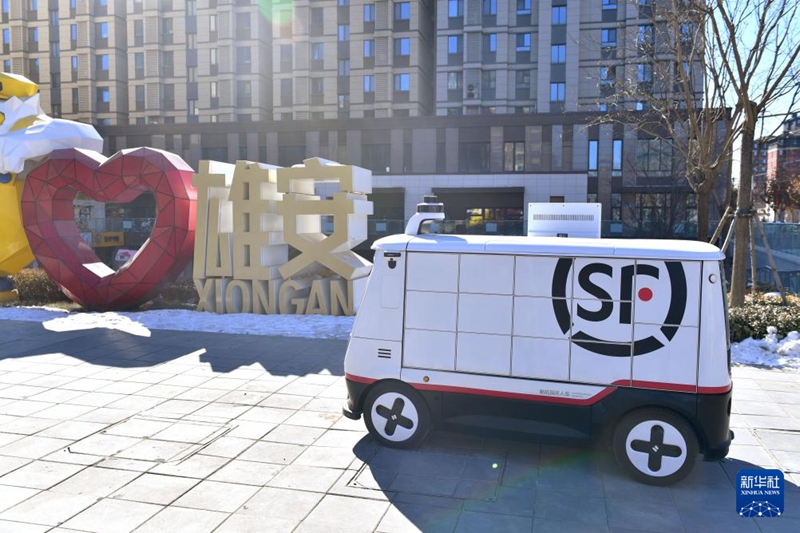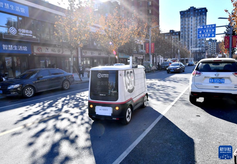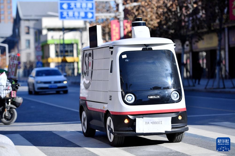 1月22日,無人駕駛配送車在派送郵件。新華社記者王曉 攝