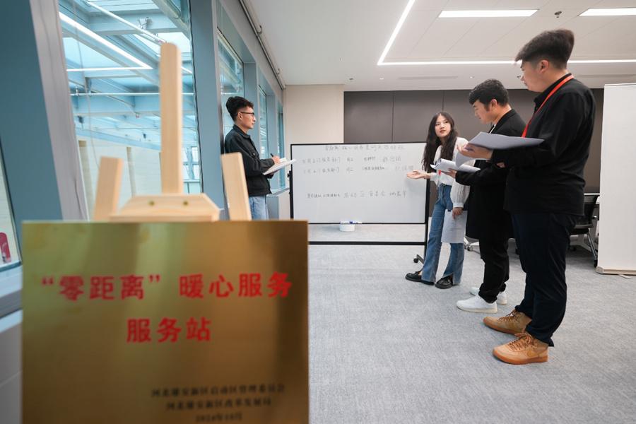 雄安新區(qū)工作人員正在中國(guó)星網(wǎng)辦公樓里安排“零距離”暖心服務(wù)星網(wǎng)排班事宜。河北日?qǐng)?bào)記者李暢 攝