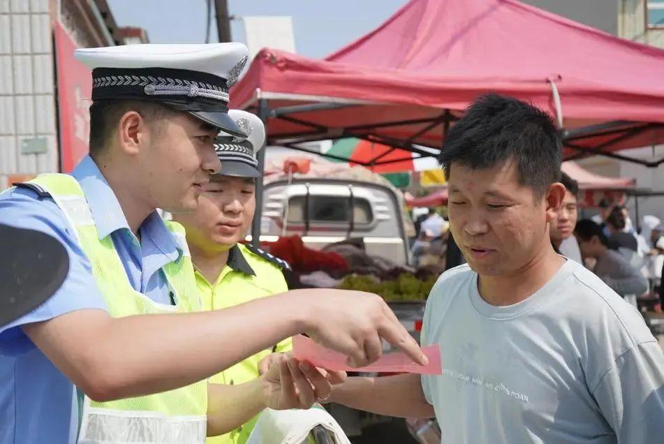 集市墻面、攤位旁,民警認(rèn)真張貼交通安全海報(bào),“向交通違法說不”等標(biāo)語醒目亮眼。把交通安全知識(shí)“貼”進(jìn)生活場(chǎng)景,讓往來群眾隨時(shí)能看到,潛移默化提升安全意識(shí)。
