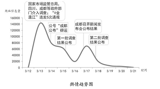 3月14日10時許,微信公眾號“成都發(fā)布”刊發(fā)文章《這些謠言信不得!》,盤點(diǎn)了警民沖突、家長跳樓、家長臥底等流傳甚廣的六大謠言。隨后,中國網(wǎng)、鳳凰網(wǎng)、四川在線等多家媒體轉(zhuǎn)載,對遏制網(wǎng)絡(luò)謠言起到?jīng)Q定性作用。相關(guān)部門回應(yīng)后,公眾討論逐步回歸食品安全本身,輿情呈現(xiàn)降溫跡象。