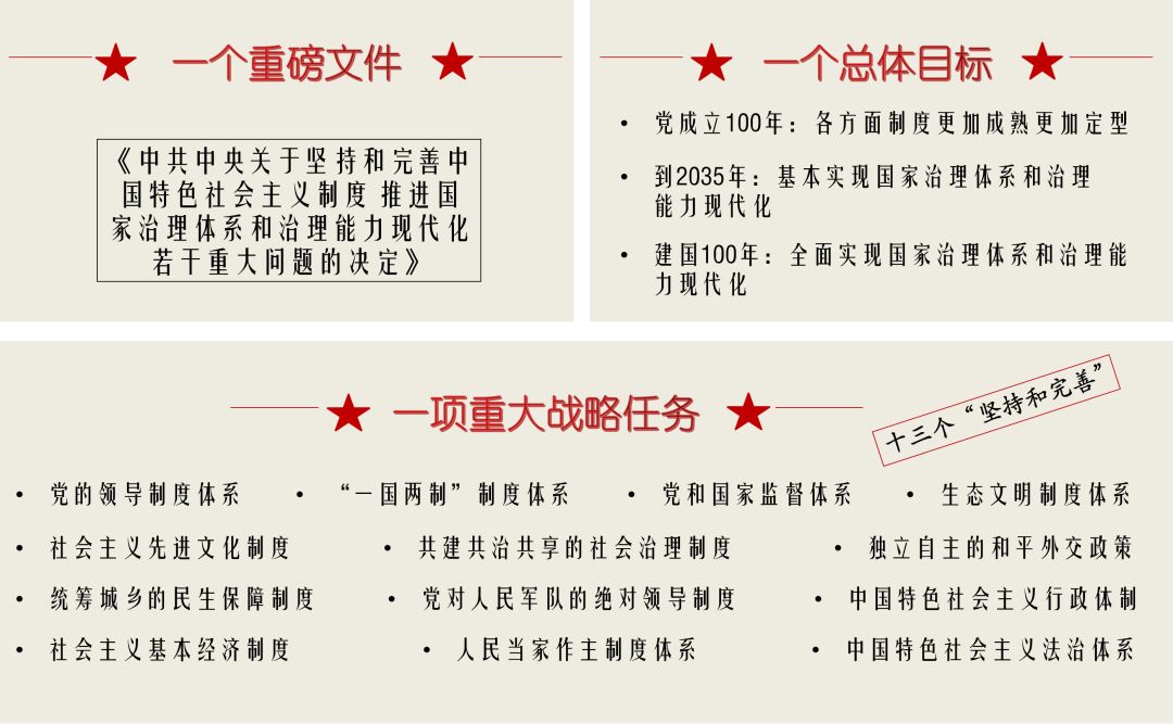 10月28日至10月31日,中國共產(chǎn)黨第十九屆中央委員會(huì)第四次全體會(huì)議在北京召開。會(huì)議審議通過了《中共中央關(guān)于堅(jiān)持和完善中國特色社會(huì)主義制度、推進(jìn)國家治理體系和治理能力現(xiàn)代化若干重大問題的決定》(以下簡稱《決定》)。10月31日,四中全會(huì)《公報(bào)》發(fā)布;11月5日,《決定》全文發(fā)布。