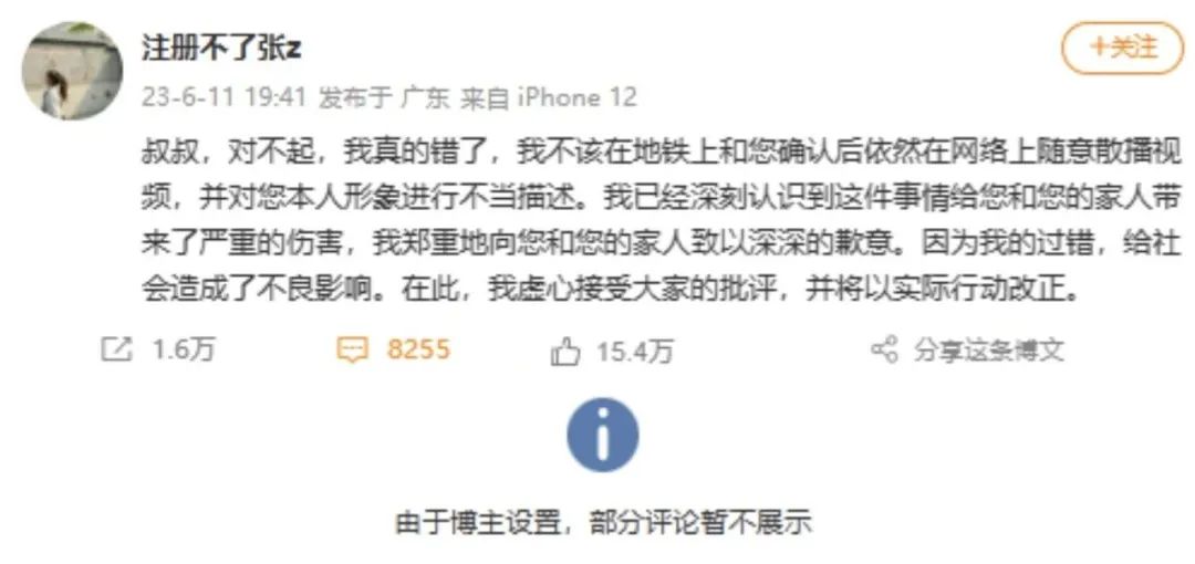 6月11日,被懷疑偷拍男子的兒子鄧某通過(guò)《南方都市報(bào)》發(fā)聲,稱父親是農(nóng)民工,當(dāng)天坐地鐵想在廣州轉(zhuǎn)轉(zhuǎn),未曾想到被當(dāng)做“猥瑣男”發(fā)到網(wǎng)上。他希望涉事女子公開道歉,否則將選擇起訴。該表態(tài)獲得大量網(wǎng)民支持。當(dāng)日,鄧某陪同父親到廣州鷺江站派出所報(bào)警,張某致歉,雙方再次達(dá)成和解。鄧某表示,她還是一名學(xué)生,公開道歉就好,不想影響她太多。當(dāng)日19時(shí)許,“@注冊(cè)不了張z”發(fā)博致歉,這條微博引發(fā)網(wǎng)民評(píng)論8000余條,但張某關(guān)閉了評(píng)論功能,僅顯示一條為其“站臺(tái)”的精選留言,很快有網(wǎng)民發(fā)現(xiàn)該賬號(hào)為張某小號(hào)。這一“操作”徹底激怒網(wǎng)民,有網(wǎng)民諷刺稱:“用專業(yè)優(yōu)勢(shì)帶風(fēng)向,發(fā)現(xiàn)‘失手’后先大號(hào)道歉,再小號(hào)帶節(jié)奏,不愧是傳媒學(xué)院的高材生?!比绯钡馁|(zhì)疑聲中,張某所在的四川大學(xué)也遭遇壓力,不斷有網(wǎng)民頻繁催促校方處置此事。6月12日,四川大學(xué)再次回應(yīng)稱仍在調(diào)查,但否認(rèn)網(wǎng)傳將要開除涉事女生的信息,輿情熱度持續(xù)走高,并于6月14日觸頂。
