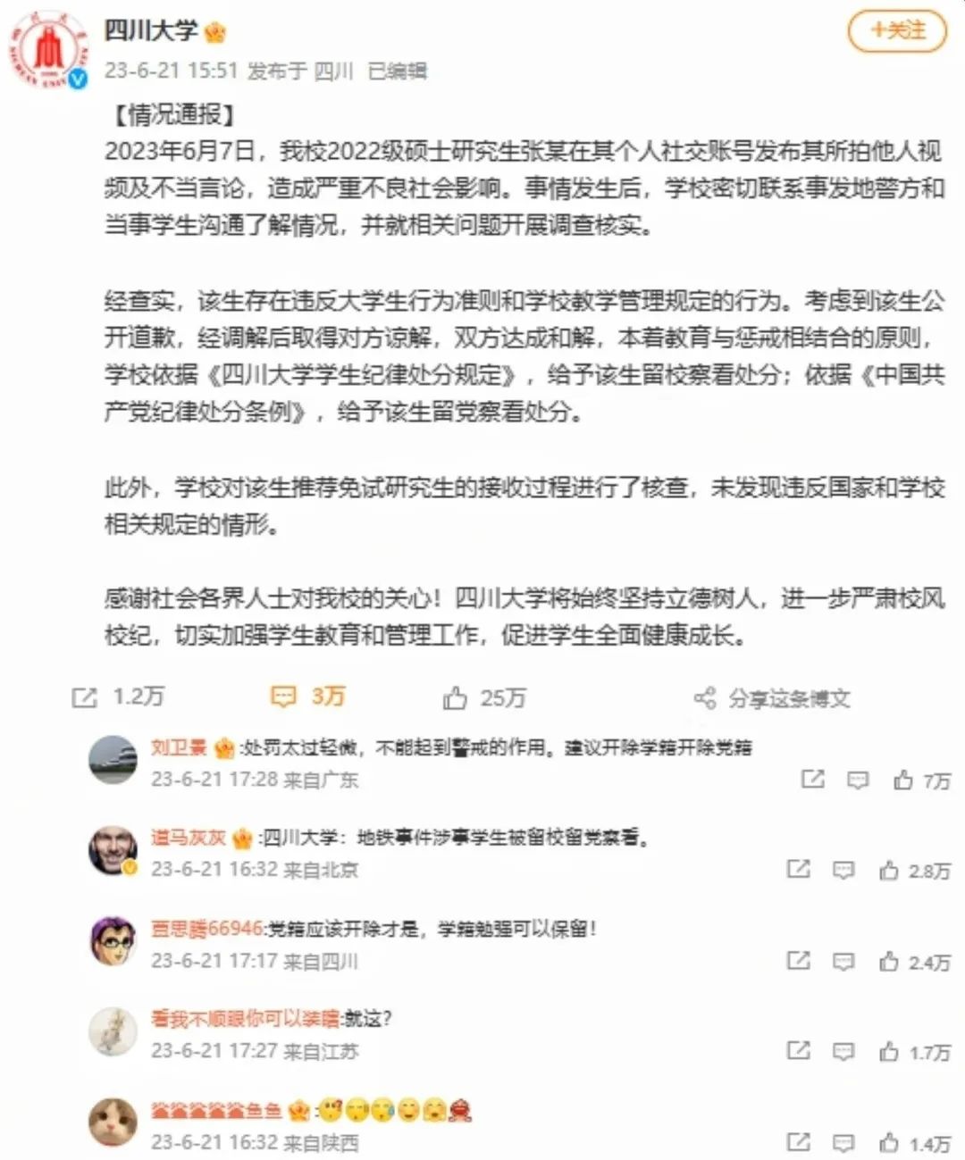 歷經(jīng)較長(zhǎng)的沉淀期后,6月21日,四川大學(xué)官微發(fā)布通報(bào)稱,最終給予張某留校和留黨察看處分。經(jīng)對(duì)張某保研過(guò)程進(jìn)行核查,未發(fā)現(xiàn)其違反國(guó)家和學(xué)校相關(guān)規(guī)定。多數(shù)網(wǎng)民不認(rèn)可此結(jié)果,認(rèn)為四川大學(xué)放任學(xué)生不當(dāng)行為,處置不公。有網(wǎng)民反問(wèn)稱“明顯的造謠,為何僅以道歉結(jié)束”;還有網(wǎng)民認(rèn)為高校的教育機(jī)制和培養(yǎng)標(biāo)準(zhǔn)出現(xiàn)問(wèn)題,質(zhì)疑如此品行的大學(xué)生將來(lái)進(jìn)入媒體,職業(yè)素養(yǎng)堪憂。大V“@老徐時(shí)評(píng)”指出:“造謠也好,拒不道歉也好,這些都屬于個(gè)人品德問(wèn)題,并不是重點(diǎn)。這個(gè)事件的重點(diǎn),是后續(xù)被發(fā)現(xiàn)的保研等問(wèn)題,關(guān)系到教育公平,關(guān)系到普通百姓的上升渠道和上升空間。”6月25日,北京一家律師事務(wù)所發(fā)布通報(bào),認(rèn)為四川大學(xué)的畢業(yè)生品質(zhì)難以信服,故該所不再招聘該校畢業(yè)生。部分網(wǎng)民對(duì)此叫好,部分人則認(rèn)為此舉涉嫌炒作和就業(yè)歧視?!癅人民日?qǐng)?bào)”評(píng)論呼吁,莫因個(gè)體案例為群體“貼標(biāo)簽”。