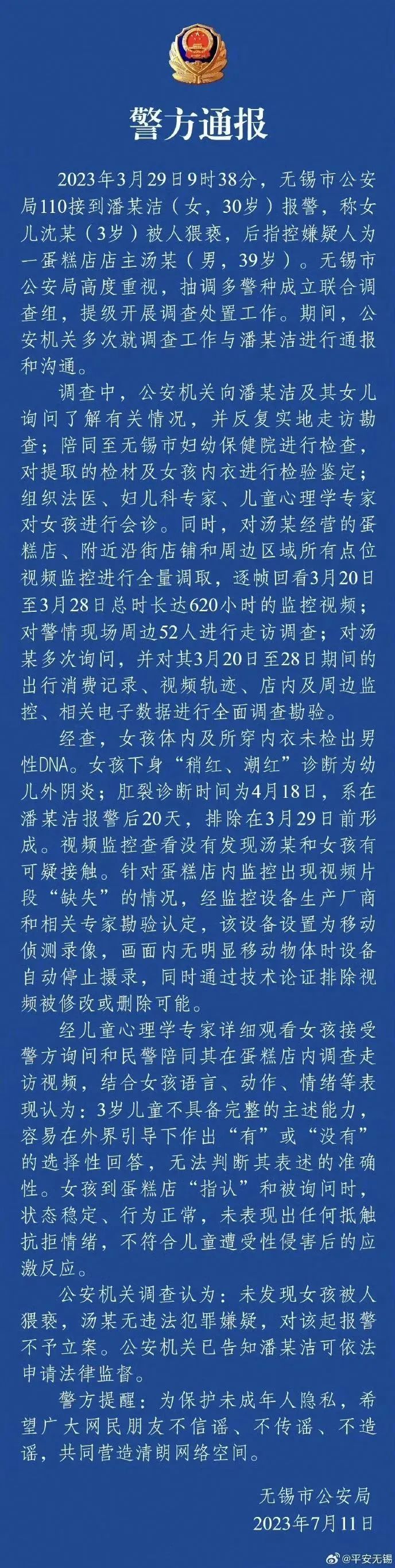 面對巨大的輿情壓力,7月11日,無錫市公安局發(fā)布通報,詳述調(diào)查過程,包括DNA檢測、肛裂原因排除、視頻監(jiān)控核查、心理學家判定等內(nèi)容。通報全文800余字,邏輯清晰、內(nèi)容詳實,“不存在猥褻行為”這一結(jié)論獲得輿論認可,“#警方通報無錫3歲女童事件調(diào)查結(jié)果#”等微博話題閱讀量累計近6億。至此,輿情反轉(zhuǎn),多數(shù)網(wǎng)民指責潘某潔虛構(gòu)事實、利用女兒造謠污蔑,呼吁依法對其嚴懲。