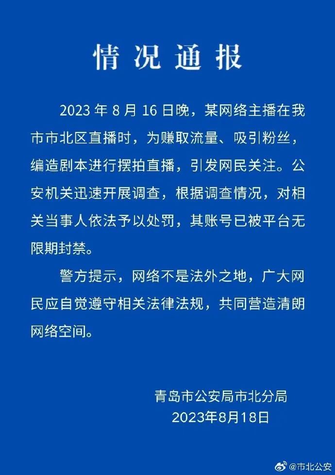 8月18日,青島市公安局市北分局微博賬號(hào)“@市北公安”通報(bào)稱(chēng),某網(wǎng)絡(luò)主播在青島市市北區(qū)直播時(shí),為賺取流量、吸引粉絲,編造劇本進(jìn)行擺拍直播。公安機(jī)關(guān)對(duì)相關(guān)當(dāng)事人依法予以處罰,其賬號(hào)已被平臺(tái)無(wú)限期封禁。“#二驢#”“#警方通報(bào)網(wǎng)傳二驢直播被綁架#”等多個(gè)話題閱讀量近6.7億。輿論對(duì)此結(jié)果表示認(rèn)同,評(píng)論稱(chēng)“山東警方果斷調(diào)查處置,結(jié)果大快人心”。